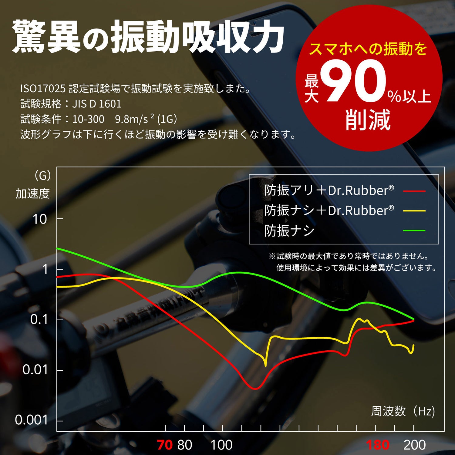防振対策なしのスマホホルダーと比較し、「Dr.Rubber®」を装着した場合には最大で90%以上の衝撃&振動をカットできることが実証されました。 -